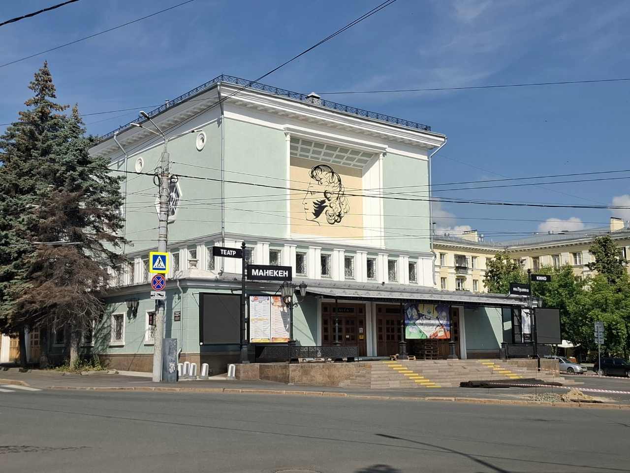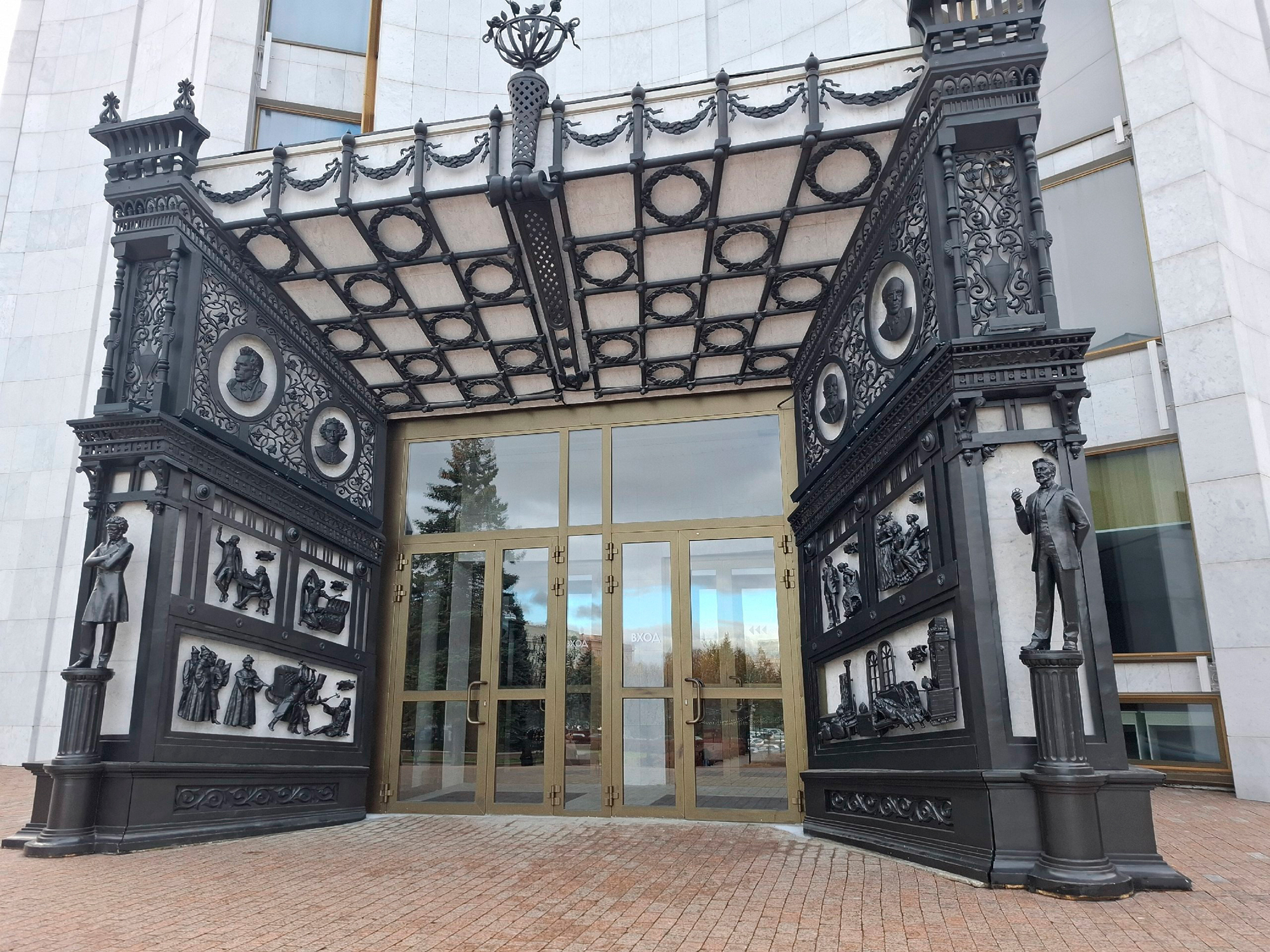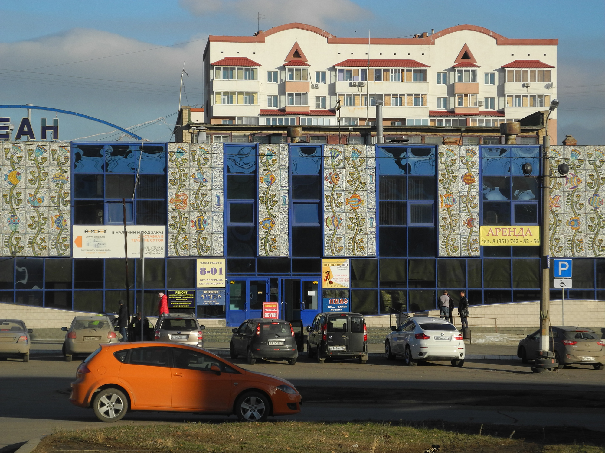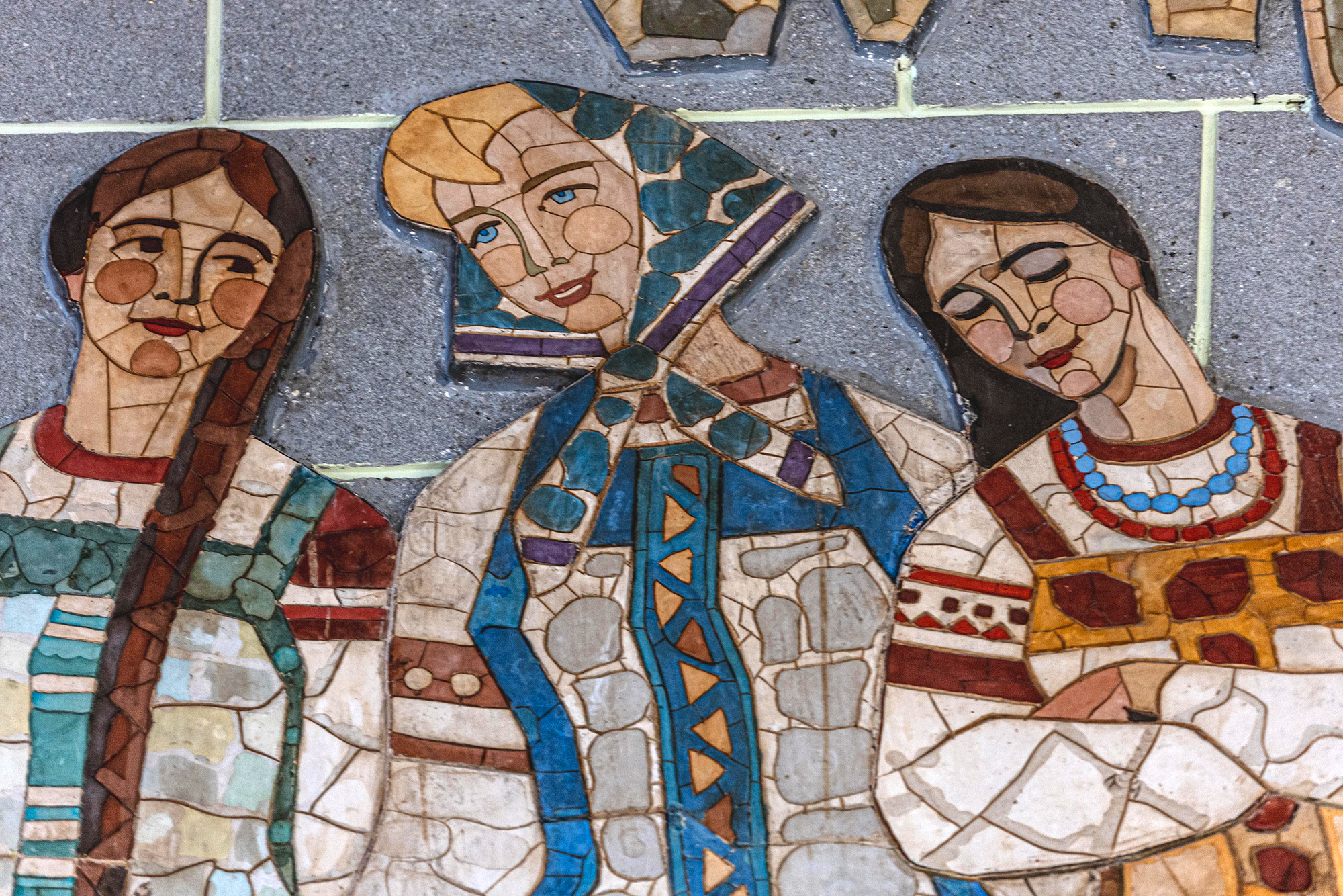 Материал позволял работать с цветом, масштабом и темой здания одновременно, превращая фасад в самостоятельный художественный образ.